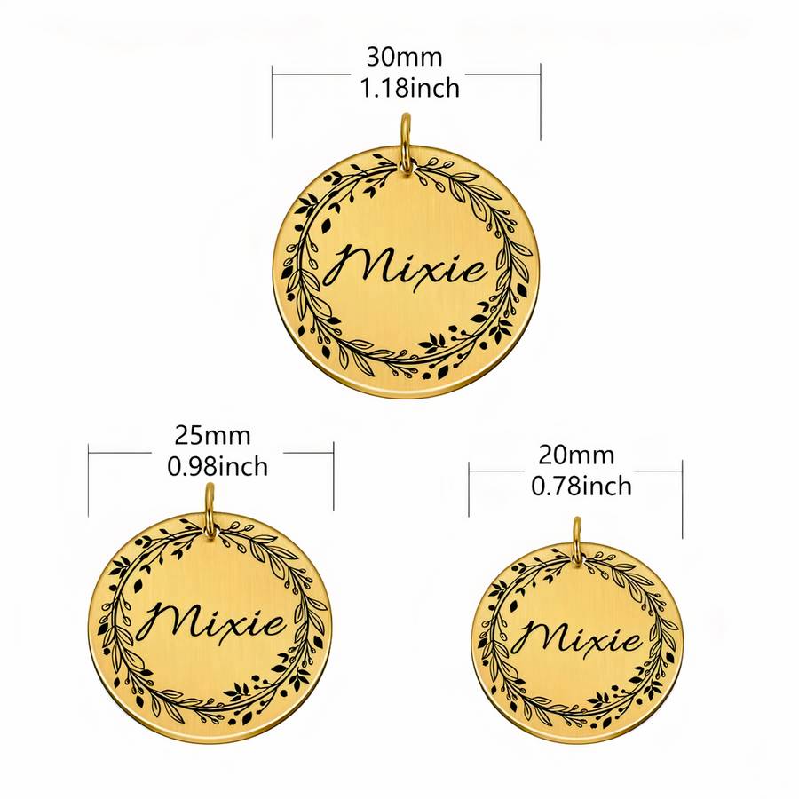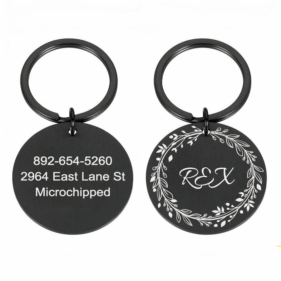 Ces étiquettes ont des formes rondes et sont ornés de motifs de fleurs sur les côtés. Non seulement ils sont proposés avec des différents noms pour chiens qui sont gravés dessus, mais ils sont aussi disponibles dans de nombreux couleurs.