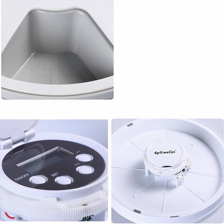 Vous pouvez même programmer le rappel vocal pour qu’il se déclenche à des moments spécifiques de la journée. Le distributeur est alimenté par 4 piles AA (non incluses) et peut contenir jusqu’à 2,2 kg de nourriture sèche.