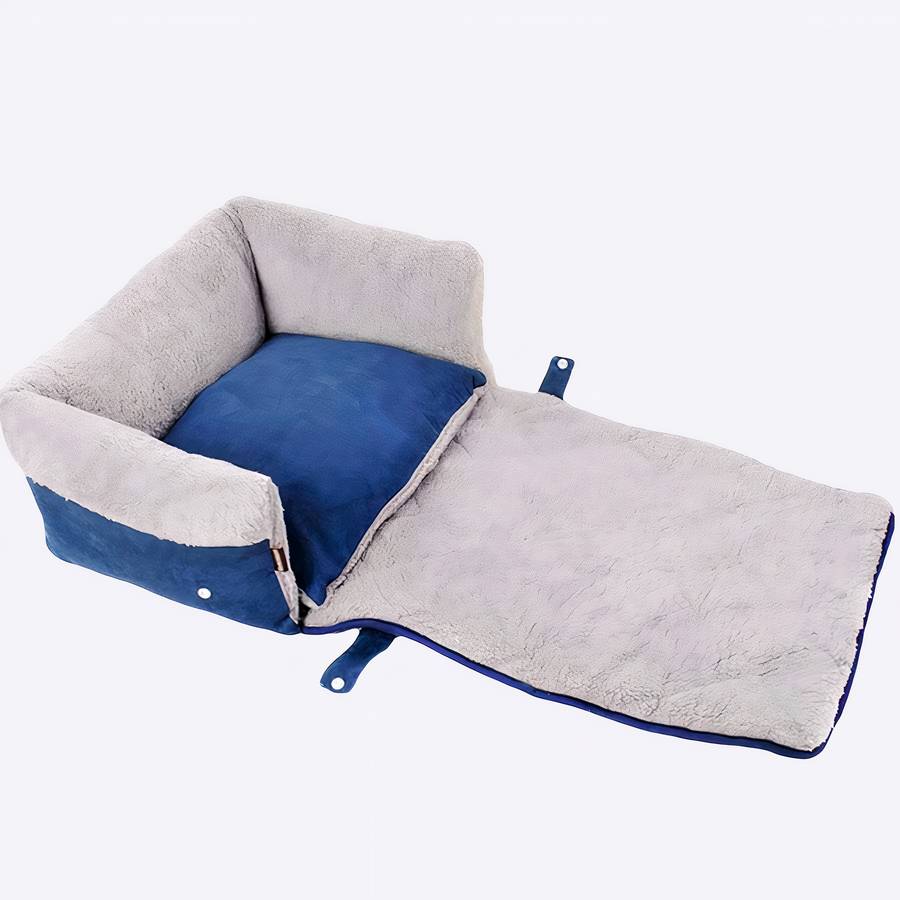 Le tapis peut être plié et fixé à l’aide d’une fermeture à bouton pression. Elle peut aussi s’étendre pour servir de couverture et de tenir votre chien au chaud la nuit.