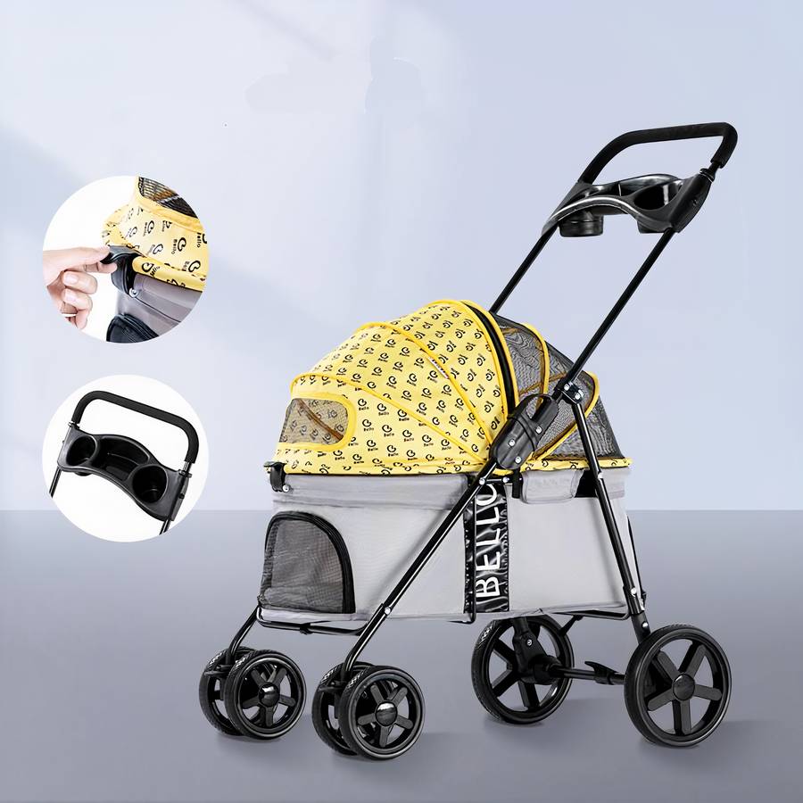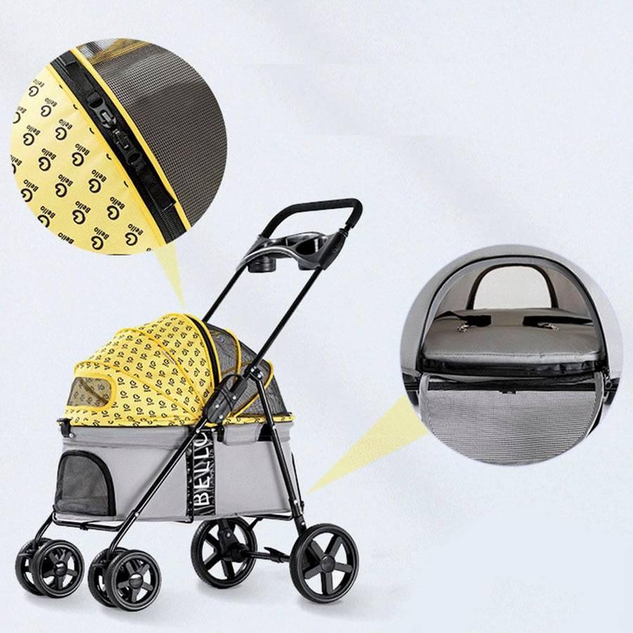 La poussette est équipée d’une poignée ergonomique et d’un siège rembourré amovible pour plus de confort. De plus, elle est disponible en deux couleurs élégantes : gris et jaune. Cette poussette respirante pour chien est le moyen idéal pour promener votre animal avec style et confort.