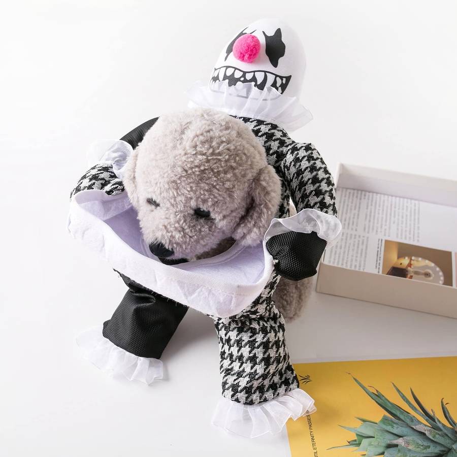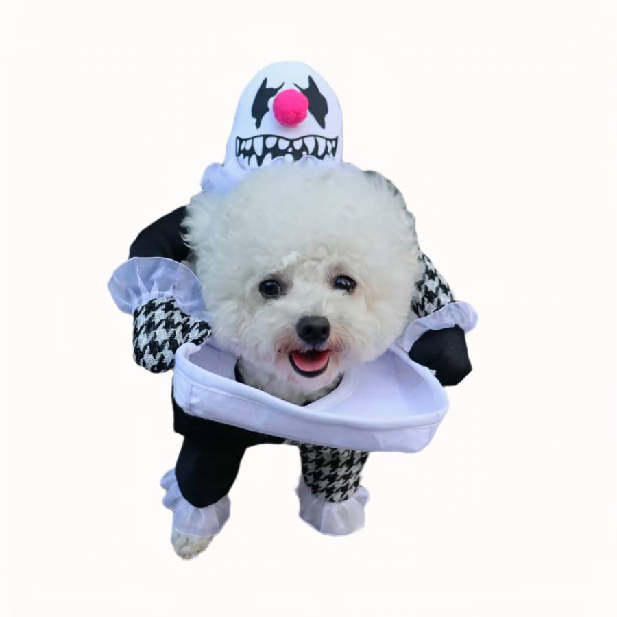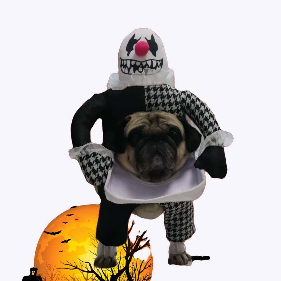 Ce déguisement totalement inédit transforme votre chien en un véritable clown tueur une fois enfilé ! Lorsque votre chien se déplace, les jambes du clown bougent en fonction des mouvements de votre chien, ainsi, on a véritablement l’impression de voir un clown en train de marcher ou de courir suivant la vitesse à laquelle votre chien marche.