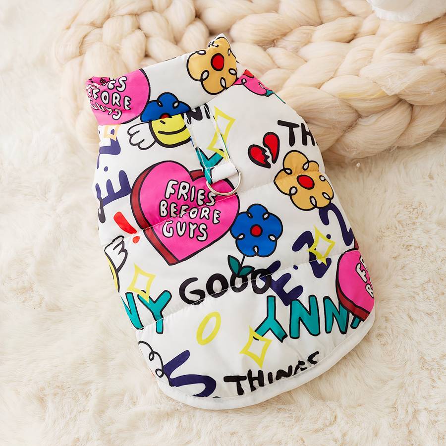 Les graffitis audacieux et les couleurs vives font de cette doudoune un véritable accessoire de mode pour votre animal, lui permettant de se démarquer lors de ses promenades en ville ou dans le parc.